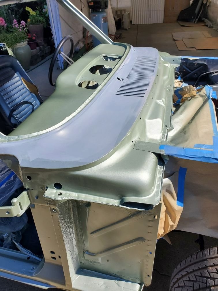 I spent a good amount of time Fri-Sun about 24hrs total getting jams, under hood/trunk and inside doors done. Man, the prep time was a bear. Parts have been sitting around with old primer and dust. The light green is Agave green metallic singe stage. Coming out nice.