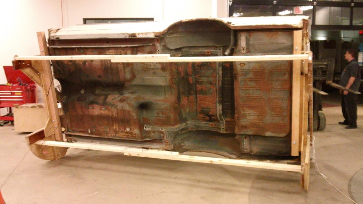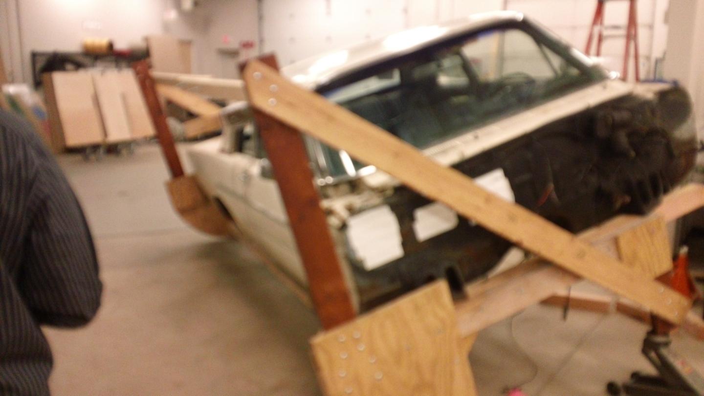 I saw this "jig" on the interweb and watched a couple of Youtubers roll there cars so that they could work on the bottom side of floor pan. I decided to give it a try. My challenge is/was that I haven't gutted the car yet and the 66 Custom is a little heavier than the unibody cars that I saw this used on. I beefed up the jig, adding some front to back stringers to remove any worries I had about the thing collapsing under the weight of the body, which I estimate is in excess of 2000 lbs. Last night I gave it try and rolled my car. Here are some pictures.