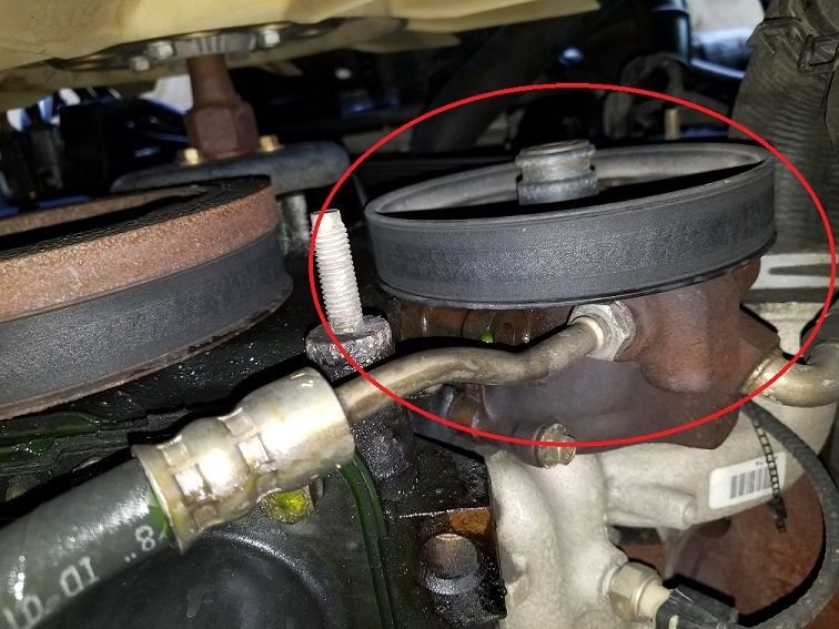 I have had an annoying coolant leak for a while now. It seemed to only show up with it was cold out. Well today while it's warm out I notice a wet spot under the front of the van. It's coolant. I look under and I can see it dripping. It looks like it's dripping from this one part that I am not sure what it is. I have attached a pic with it circled. I thought maybe the water pump but this has a hose connected to it. If this is in fact the spot of my leak, why is this part? I took this picture from looking from the underside of the engine. The part is located on the right side of the motor.