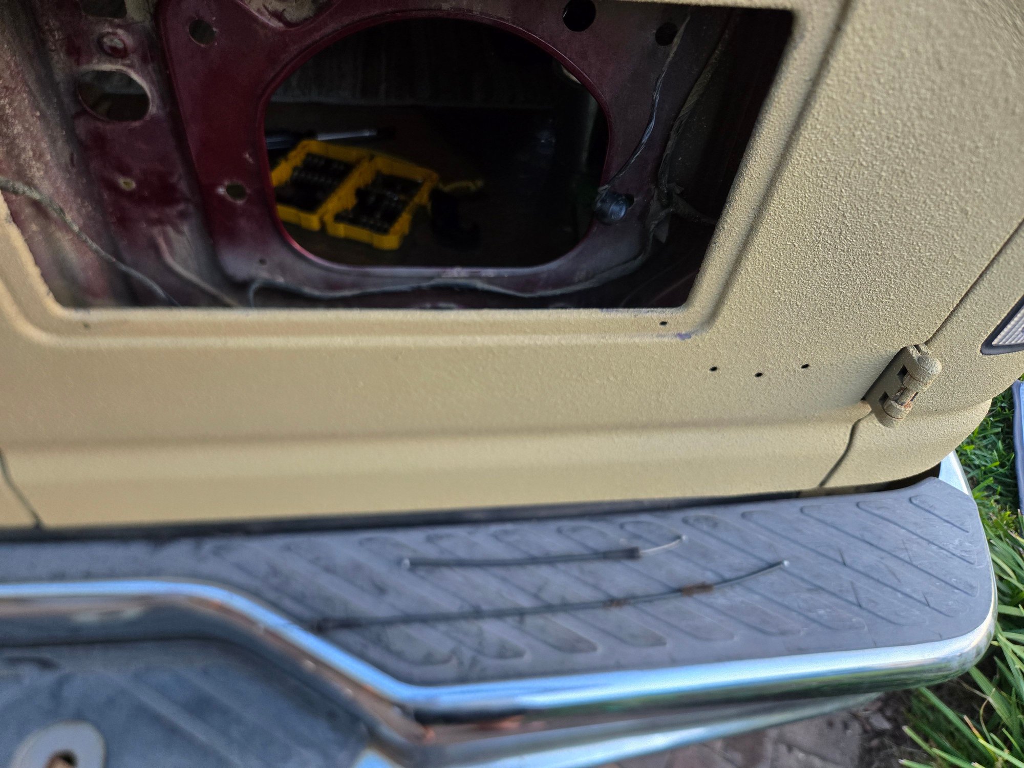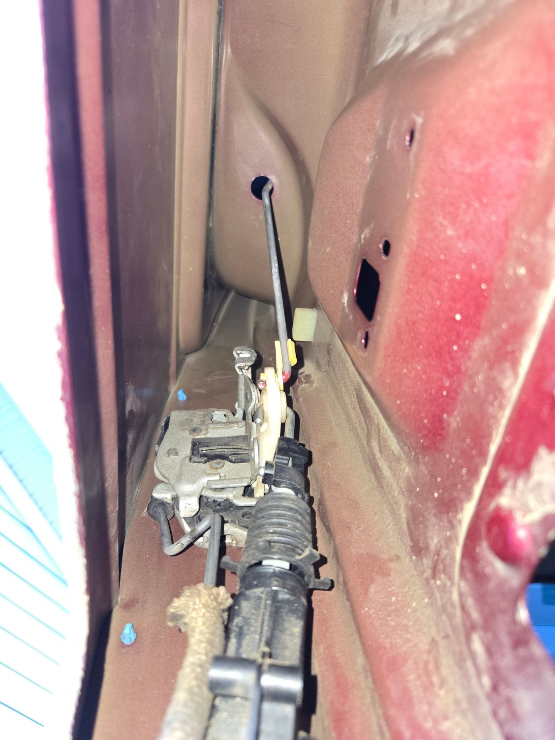 This was helpful thank you. I popped that white plastic piece out up top of the picture and could access the latch with a small flathead screw driver. Torqued it down and she popped right open. Now to the latch and cables. Need to jump on youtube for that. Thanks again!