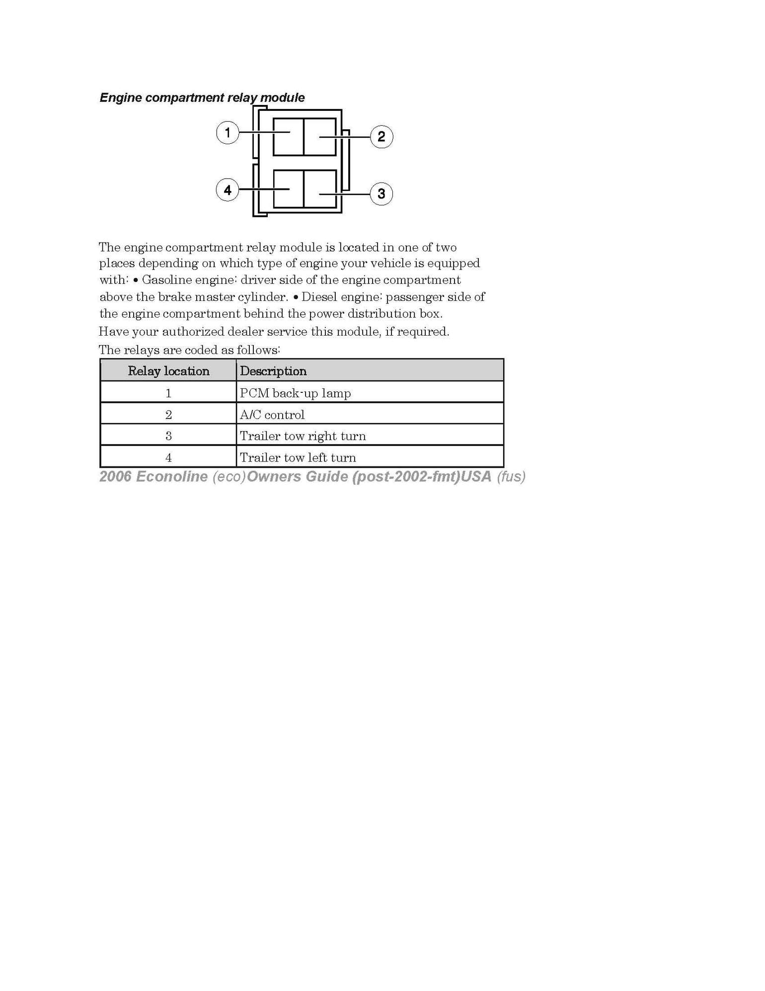 I own a 2006 Ford E-450 (Winnebago Aspect). I just had a problem with the backup lamps not lighting. I determined it was the relay, located in Position 1 of the Engine Compartment Relay Module (on the firewall, above the brake master cylinder). Through process of elimination (and swapping) I got it working and determined that position #1 is on the front of the module and the passenger side. But I do not know which way it is oriented, so I don't really know which ones are 2, 3 & 4. As long as I swapped with 3 or 4 I am fine (those are turn signals for towing, which I do not use). But 2 is A/C Control, so I would need to swap again or get a new relay.