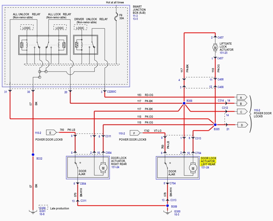 All the wiring diagrams Ive seen so far show four wires, 2 for lock motor and 2 for door ajar, Do's any one know what the 5th red wire is for, the mechanism is a 5L84 78264A01