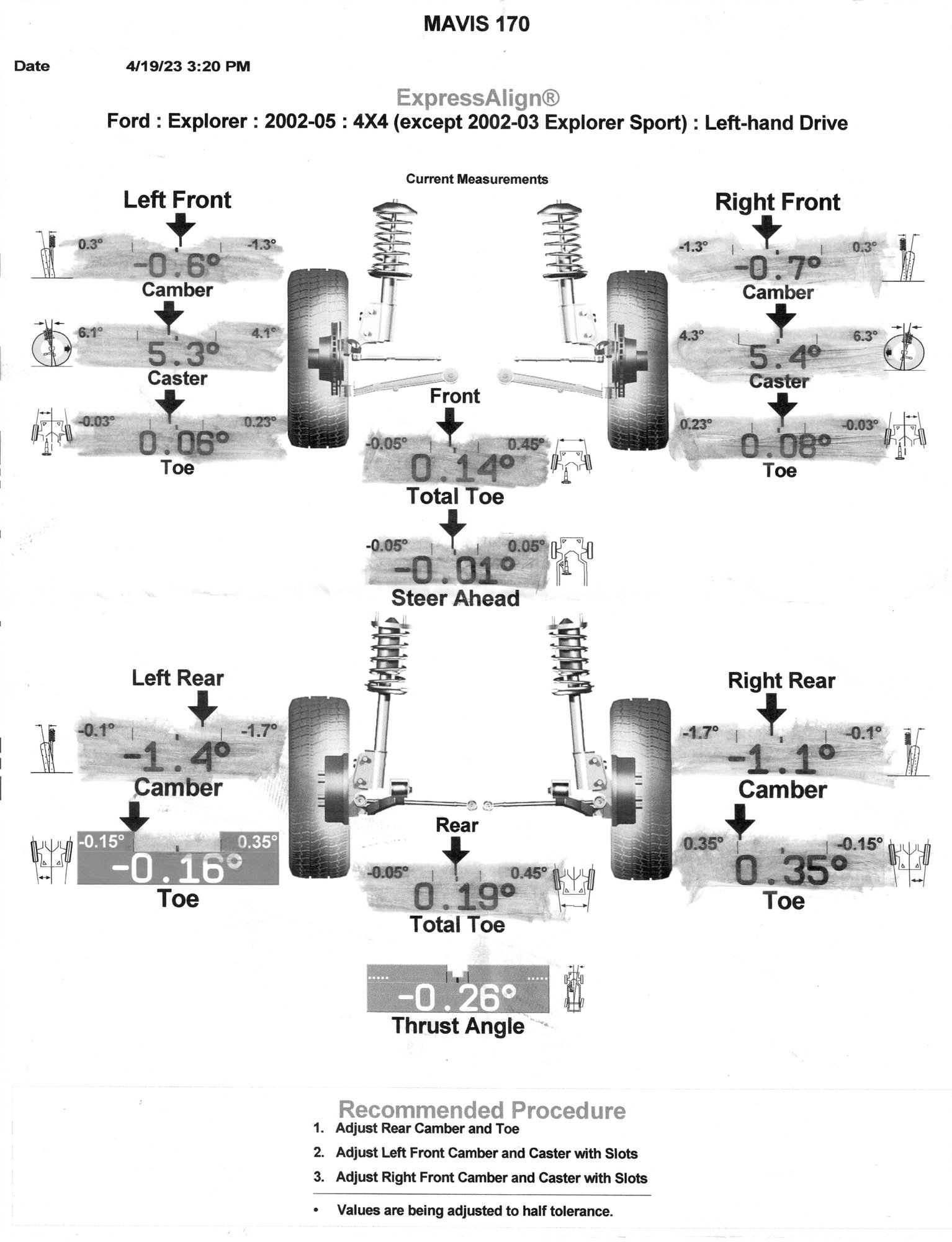 The tech said the alignment was not right and didn't even match the numbers on the sheet I gave him (from previous alignment).