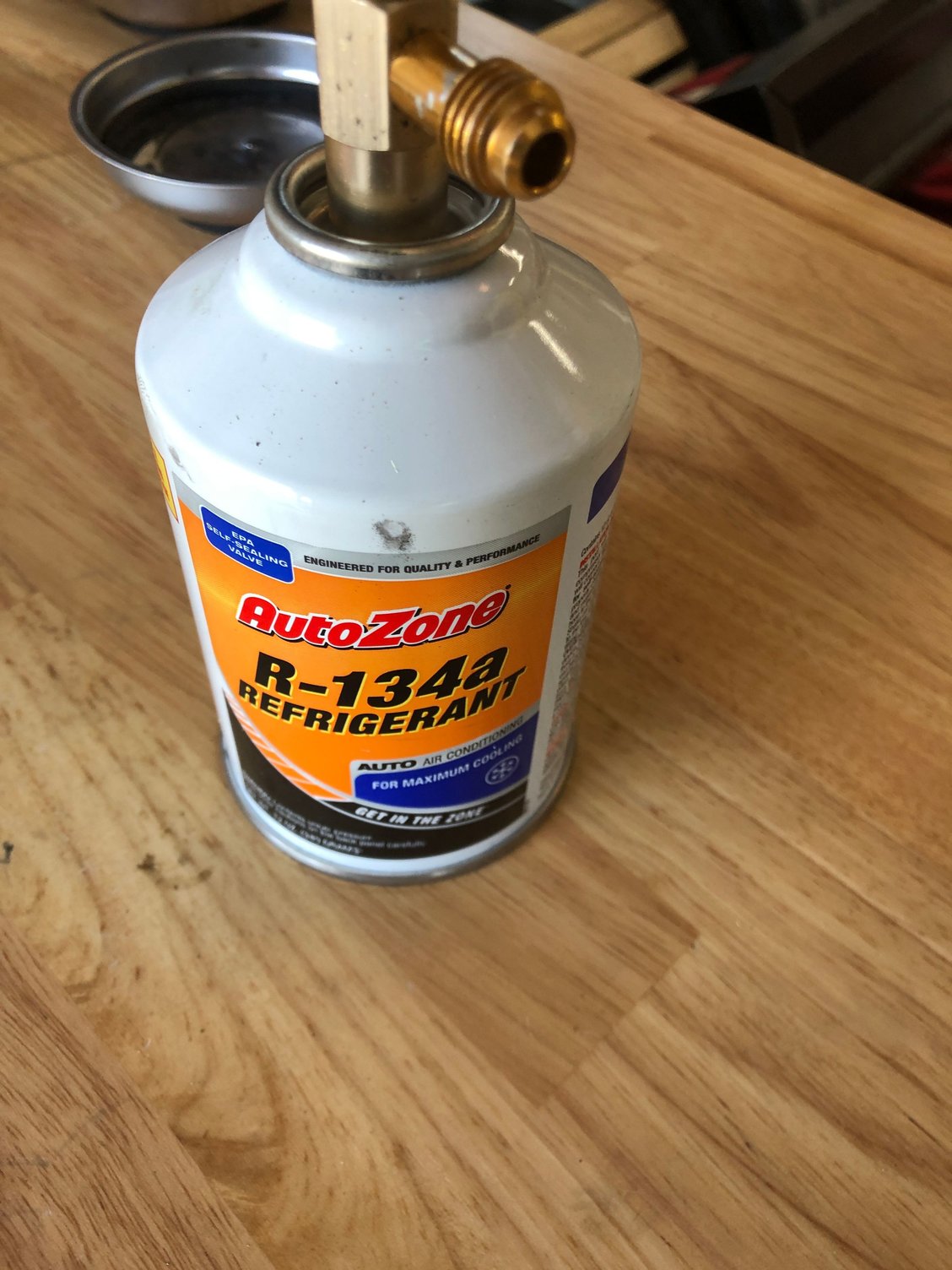 To help get the refrigerant gas into the system a little quicker when charging, you might while holding the can UPRIGHT, place it in a pan of warm water to help raise the temp in the container. Just keep an eye on the low side gauge and don't let the gas pressure go much over approx. 50 lbs otherwise remove the can from the warm water and repeat until the container is empty and you will know that when you place the container in the warm water there is no longer an increase in the low side pressure. You only need to place the bottom of the container in the water. You do have your eye protection on right?