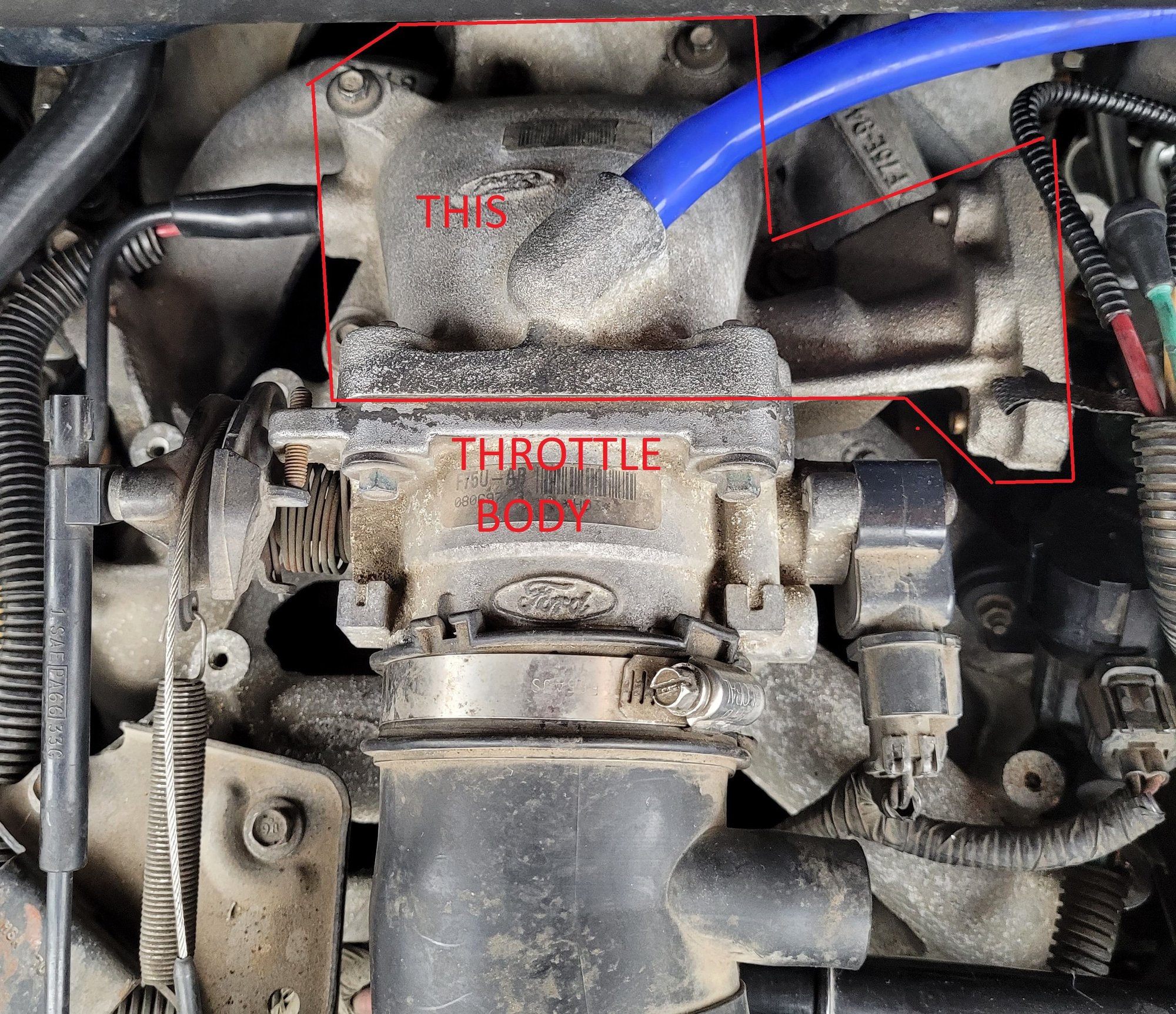 I busted the EGR mounting bolts and may need to replace the whole manifold (if cost effective), This is the part that interconnects the throttle body and upper intake manifold. It all has a few vacuum ports and mounting for idle control value and EGR value.