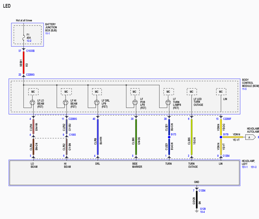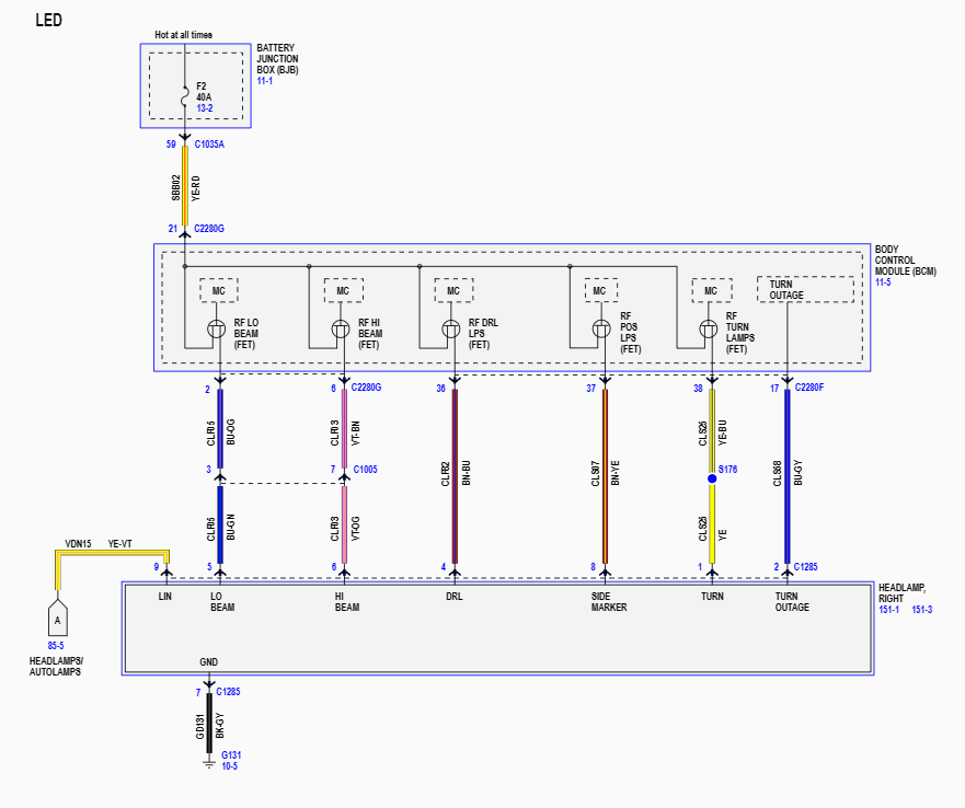 LED, Yes I have voltmeter, please give me example of capable scanning tool and I will buy it. Yes the running lights work. When the lights are on I only see two green lights icon that shows lines shining to the left and right of the two lights and the fog light icon on left. Sorry, a confusing icon so not sure what it is telling me. If I place the lights on bright the blue light comes on to show I am on bright and the fog lamp icon goes off. The two small light icons described stay on throughout process. On the truck itself, the only thing that happens is the fog lights turn off when on bright and come back on when I dim lights. Yes I am still under warranty, but again, they won't offer reasonable service and it is dangerous driving without lights. So have to do what I have to do.