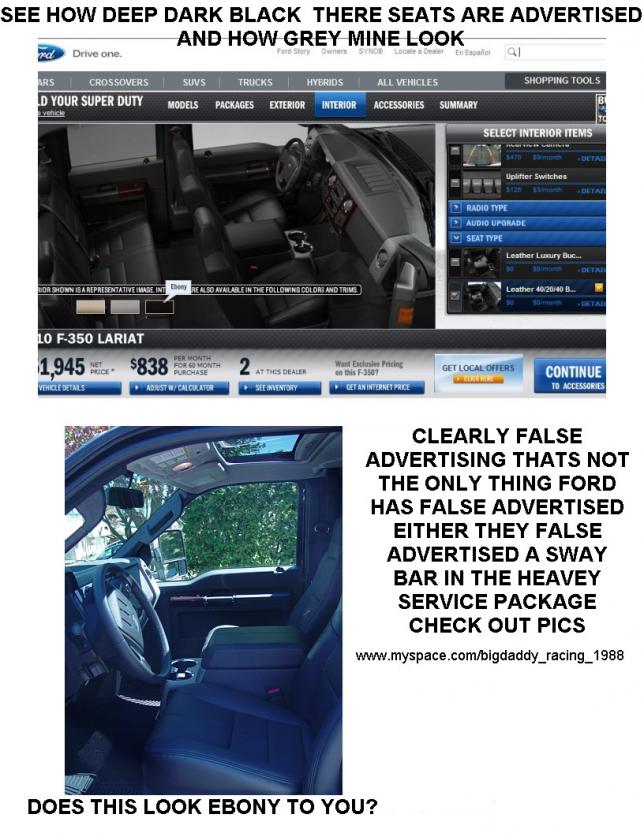 HELLO ALL I OWN A 2010 F350 CREW CAB LONG BED 6.4 DIESEL I CUSTOMED BUILT FROM FORD AT A WHOPPING PRICE OF $60,000 BASICALLY AND WHEN I RECEIVED IT IT HAD POOR PAINT JOB MISSING PARTS AND WRONG COLOR INTERIOR I AM NOW SUING FORD MOTOR COMPANY BECAUSE THEY DO NOT TAKE CARE OF THERE CUSTOMERS AND DO POOR QUALITY WORK I'M ALSO SEEKING A FALSE ADVERTISING CASE AGAINST THEM FOR COMMITTING FRAUD ON US ALL FORD DOESN'T WANT TO PAY FOR MY CRACKED HEADS AND BLOWN GASKETS THAT COST ME $8000 TO FIX ON MY 05 F350 BUT YET SUED INTERNATIONAL FOR THE COSTLY REPAIRS ON THE 6.0 AND COLLECTED MONEY FROM THEM BUT NOT PAYING OUT ALL 6.O WARRANTY CLAIMS MY HEADS WHERE DEFECTIVE AND CRACKED IN ALL 8 CYLINDERS AND I RAN NO POWER ADDERS IT WAS STOCK CHECK OUT THE PICS OF THE POOR PAINT AND WEB SHOTS OF THER WEBSITE FOR THE FALSE ADVERTISING AND MAKE YOUR CLAIM AGAINST THEM TODAY!!!!!! ITS TIME WE STAND TOGETHER AND SHOW THEM WE ARE TIRED OF PAYING HIGH PRICES AND GETTING LITTLE IN RETURN FOR BEING A LOYAL FORD OWNER! http://www.myspace.com/bigdaddy_racing_1988 pics then goto ford motor for more images CHECK OUT THE VID http://www.youtube.com/watch?v=ZKa9K8oA6ok