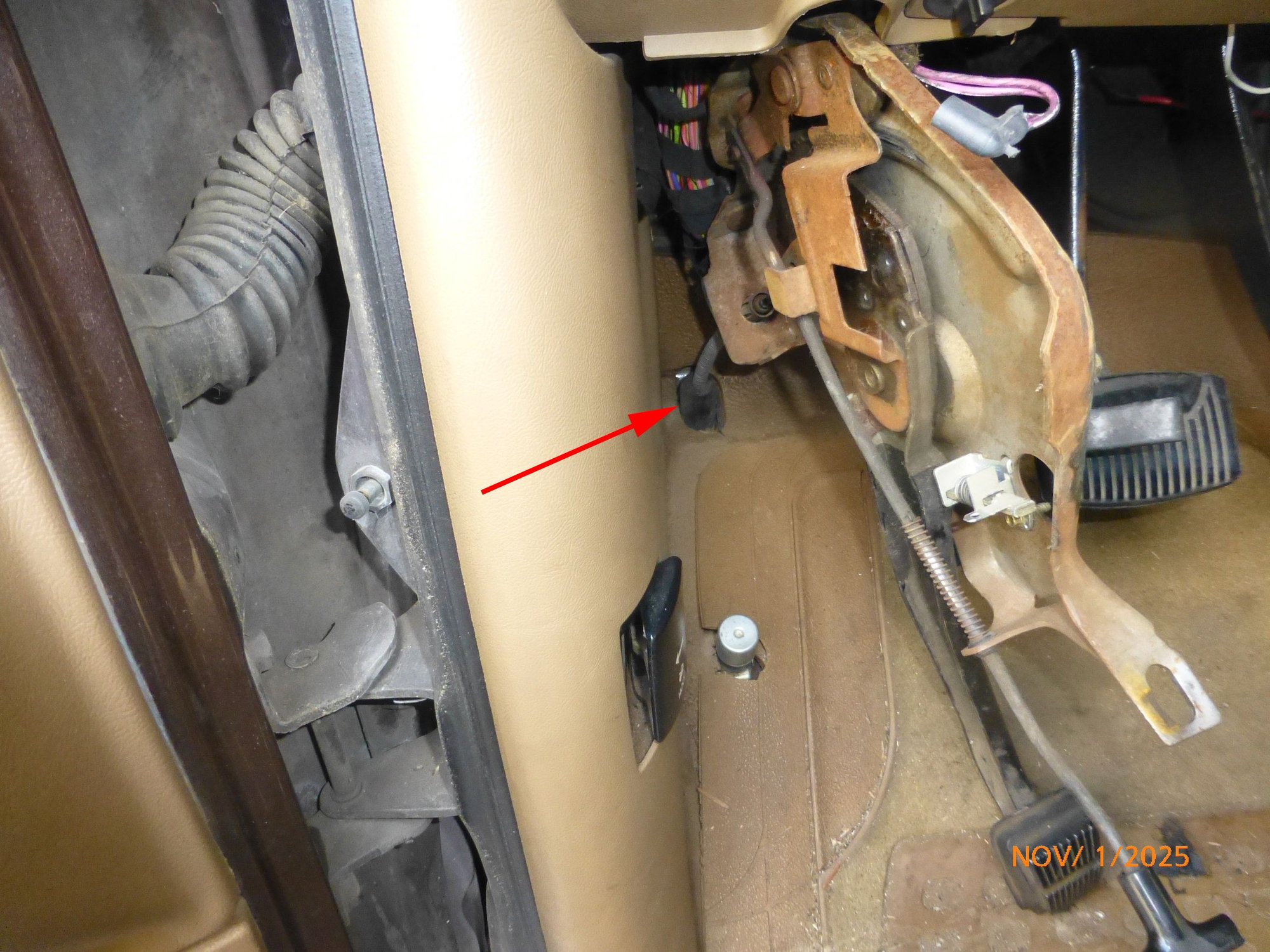 On my 1988 F-250 the emergency/parking brake no longer catches when depressing the foot pedal. I have dislocated the ratchet mechanism to examine what the problem is, but it is still attached to the cable housing. I need to slide the cable housing enough to get the cable head out of the housing but it is held to the frame by being embedded in a thick foam rubber kind of sleeve that will not move in the frame. See photo.
