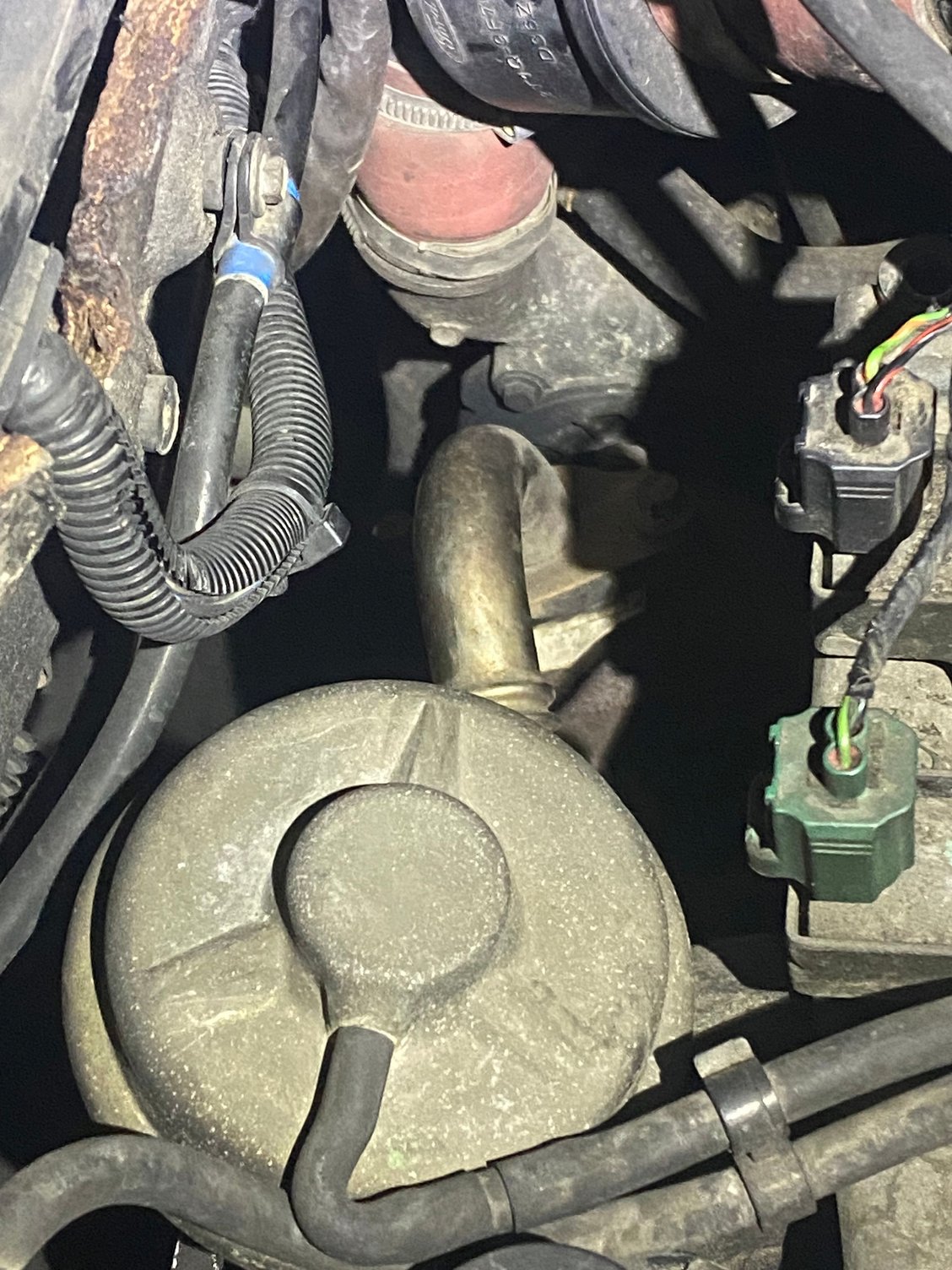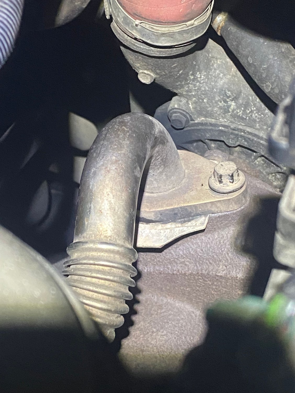 Connection showing homemade gasket from prior owner Showing connection location in relation to EGR valve (bottom of photo).