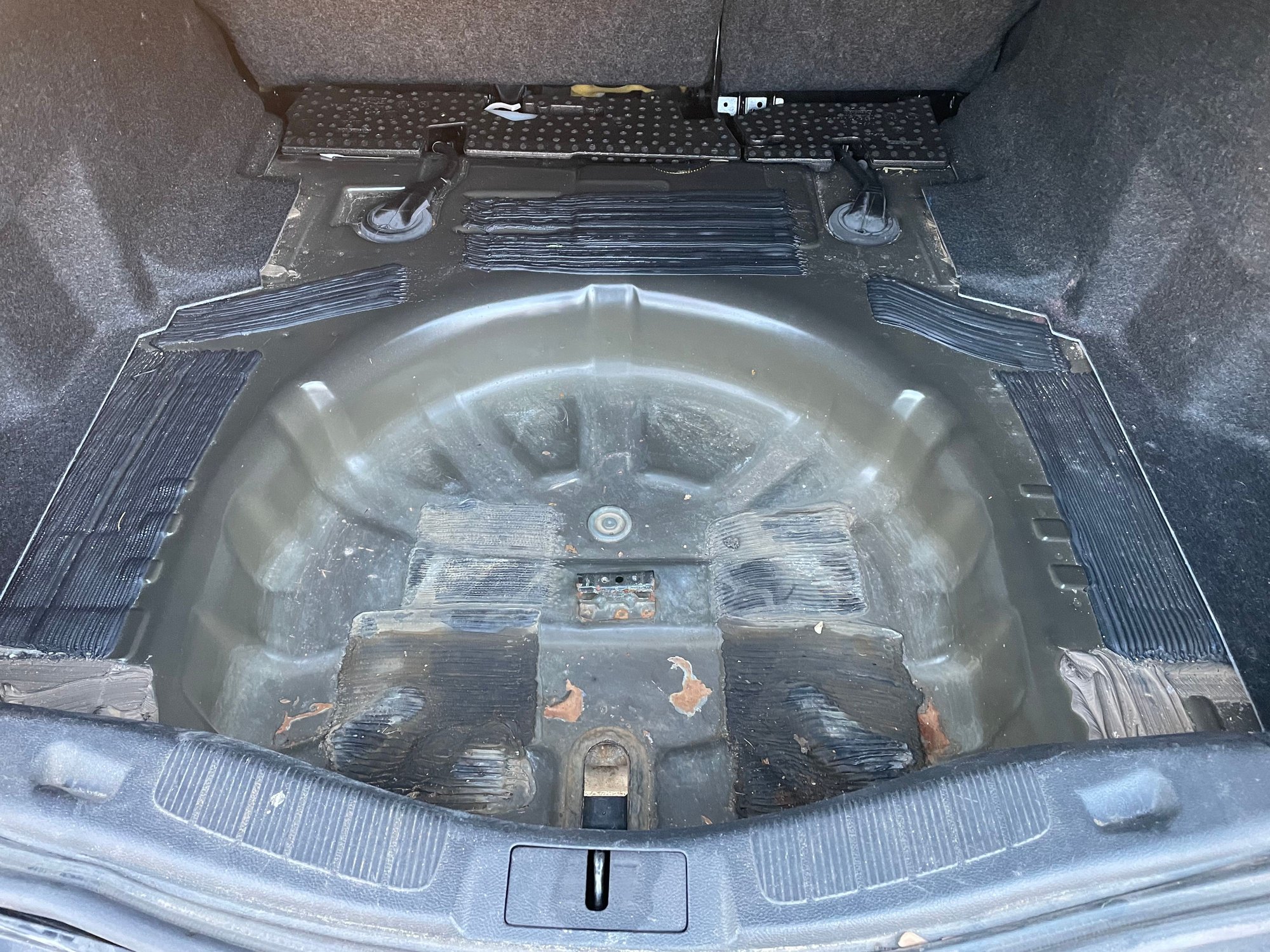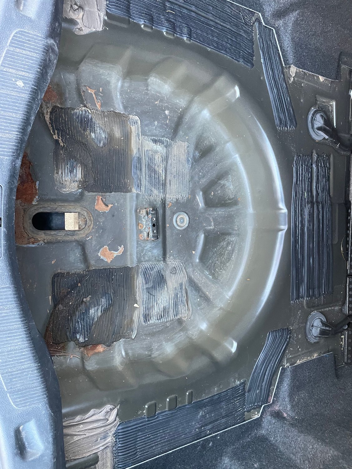 I have a hole in the trunk where my spare tire sits. Can anyone help me find the part needed to cover the hole? I thought it might be a plug, but I guess not. See the picture….