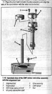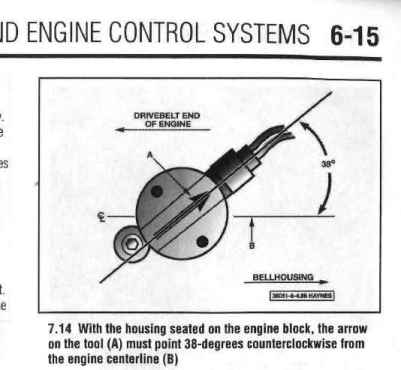 As for my questions I guess I should've looked in my Chilton’s book first because it describes all this. However it refers to 38 degrees the way2old's picture shows. I snagged a couple of pics from the manual. The alignment tool my co-worker loaned was different. It had a smaller window for the sensor vane where mine needs a much wider slot. So, I’m currently running with the sensor disconnected and it is running OK. CEL is still on, it has been since we bought the car. I’m trying to find the correct alignment tool now and will try to realign again. I did have a little trouble getting the pump shaft to line up and go into the cam sync. assy. but finally managed.