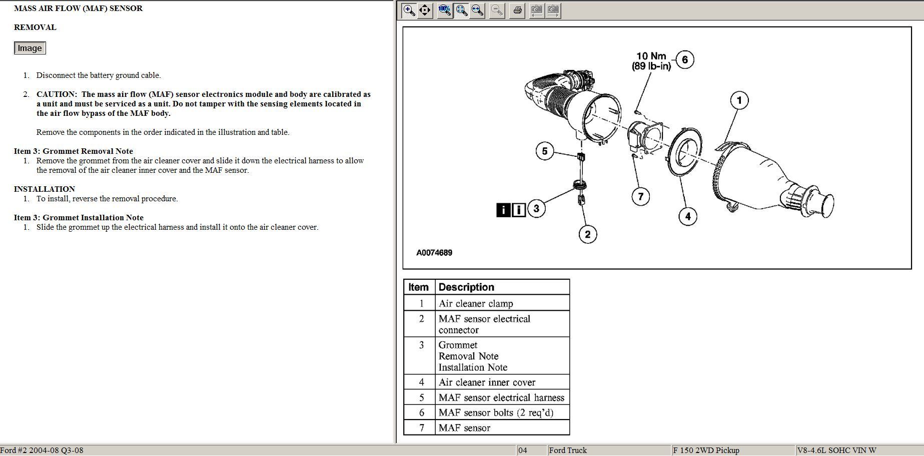 2) Locate the MAF's electrical connector and unplug it, don't need to disconnect battery ground cable. When MAF is present but not connected, default fuel trim ratio will be used.
