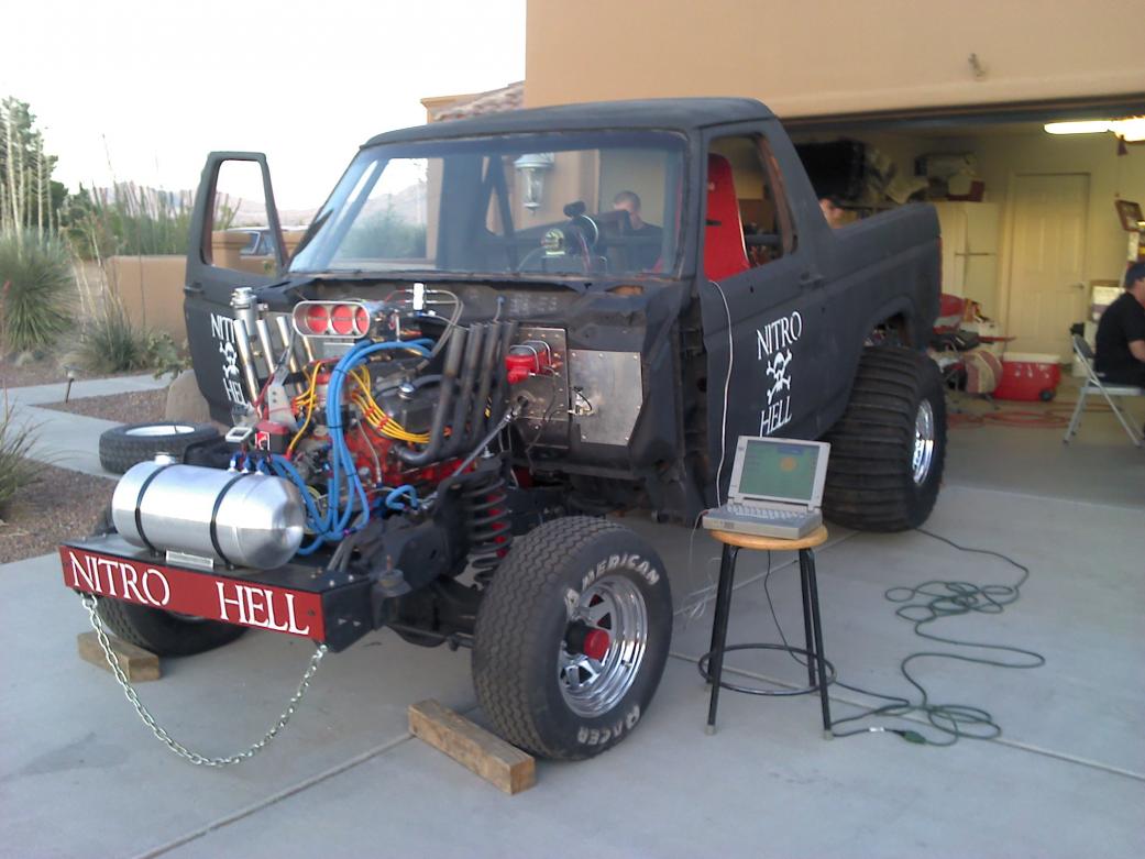 After 2 years of gathering and building parts and pieces the Nitro Hell sand drag Bronco finally got down track. Ran at the Lake El Paso meet over the weekend with 28% nitro in the tank. Made 4 passes and brought it home in one piece. Engine is a heavily modified HP 289 and the truck is a 1984 Bronco. Thought some of you guys might like to see it.